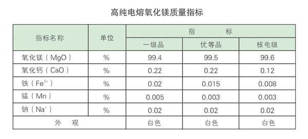 我公司高純電熔氧化鎂制作采用氧化鎂(苦鹵)和碳酸鈉(純堿)化學(xué)合成制得的試劑級(jí)高純氧化鎂(海水鎂)經(jīng)3300度電熔爐熔煉而成。此工藝制得的電熔氧化鎂純度高(可達(dá)99.9%),密度大(3.57g/ml)、晶體透明度好,具有優(yōu)良的電絕緣性和熱傳導(dǎo)性(60W/mk),主要用于國(guó)防軍工、耐火材料、電熱電器、鎧裝偶絲等行業(yè),產(chǎn)品質(zhì)量各項(xiàng)指標(biāo)達(dá)到或超過(guò)美國(guó)日本同類產(chǎn)品水平。年產(chǎn)量280噸。